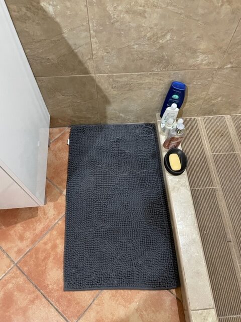 - We purchased a bath mat, toilet brush (not pictured), and two small hooks for our towels.