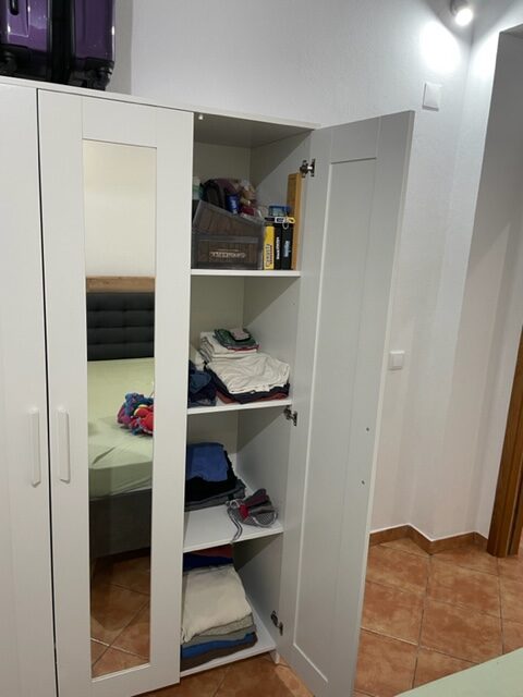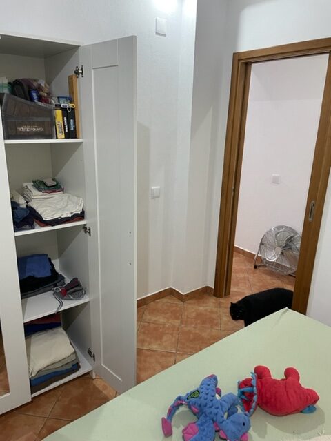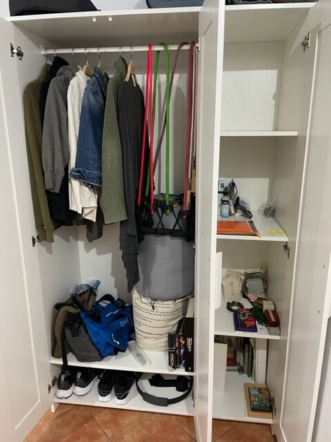 This view looking towards the front door shows our dog bed area (Basil’s travel crate opened up), shoes (all used regularly), a messenger bag (used almost daily), and part of a cat post. We talked about how everyone carries their own garbage to the dumpsters. If you have something that is possibly of use to someone else you leave it sitting outside the actual dumpster. In this case someone had put out a large cat post that was mostly destroyed. Andrew recovered two pieces, primarily for the sisal. You can see the remnants from the deconstructed piece in back of the intact one. Andrew bought one pair of slip on shoes after wearing out his flip flops, a good purchase at 9€ but the insoles have disintegrated and need replacing already. Michelle bought one pair of house shoes for €2 since she got rid of all of her old every day sandals before moving.