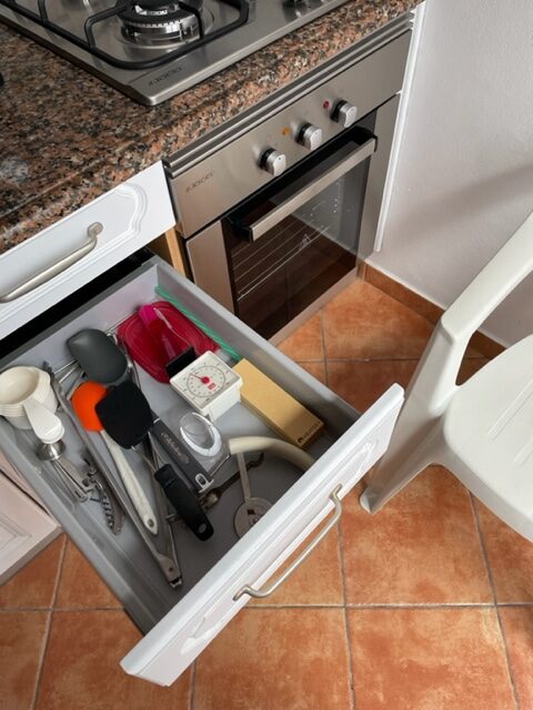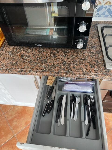 - The first drawer contains plastic silverware and a few knives, we’ll delegate them to the outdoor dining area soon. We brought baggies and wet wipes with us.