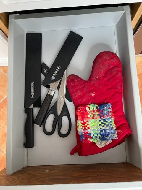 - The third drawer holds a few knives and potholders. Not pictured are dish towels and dishwashing rags. We brought two of each. None of these items were wasted space.