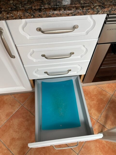 - The bottom drawer is nearly empty, a single plastic cutting board.
