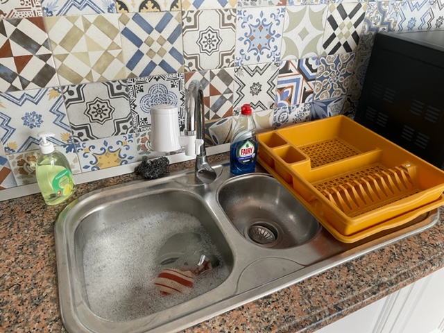 Wrapping up the tour of the kitchen is our extensive collection of plastic dinnerware. This was light and durable and traveled well in heavy luggage. We used it every day. An AAA travel book about Portugal and a fish cookery book Andrew bought just before we flew (can’t blame him for not anticipating how long it would be before we would have a stove, even though you could argue the blame for that delay rests with him). The fish cookery book is awaiting use as we don’t have very good filet knives which are a much needed addition to our knife collection.
