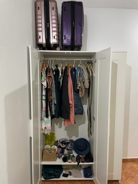 The white Ikea storage unit came with the house, along with two others which will make their appearances later. Our suitcases fit on top like a charm.