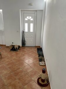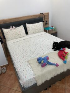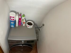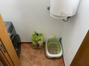 Utility Room: This room contains our hot water heater. We purchased a replacement litter box (smaller than our U.S. version) and natural pellets for litter. We also purchased a washing machine (and laundry supplies) which just fits in this tiny room. The demon twins are fed on top of the washer and their NYC bowl made the trip with us.