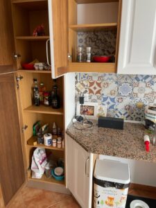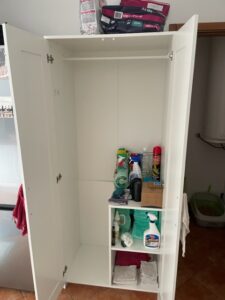 The third storage unit usually holds our broom and mop on the left. Cleaning supplies on the right. Extra pet supplies on top. We get most of our pet supplies from Zooplus which is basically a European Chewy. We brought pet cleaning supplies and clean up towels and rags with us, but most of the contents in this cabinet have been purchased in Portugal.