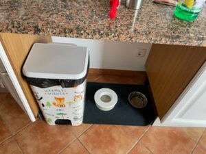 We purchased this very cute garbage can but brought the plastic mat and pet water dishes. This was helpful to have in hotel rooms and made clean up during travel much easier.