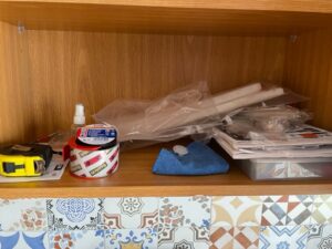 This junk cupboard holds the few tools we purchased (tape measure and a wrench), and some bits and bobs from the appliances we bought along with their manuals.