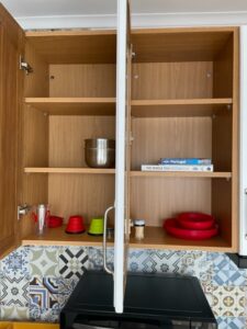 Right below the cupboard we have a charging station set up for electronics, our portable speaker (super helpful since we’ve watched a few shows on our laptop and its speaker went out right as we began traveling. The tiny corner cupboard holds our reusable shopping bags. All of this came with us.