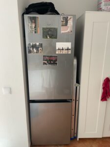 Starting with the fridge we bought. On top is my hiking pack which was previously with the other camping gear. The favorite non-essential things we brought is a set of fridge magnets which hold pictures from our wedding, they make us happy every time we see them. Inside the freezer you would find newly purchased things: some ice trays and reusable ice packs which we use to bring cold items home when shopping.