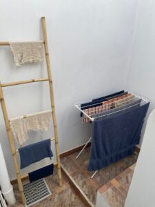 Patio Nook: Outside of the kitchen is a small patio nook. The bamboo ladder was here upon our arrival. The clothes drying rack was a gift from our expat friend Darmel. This space is used for drying clothes in the Mediterranean sun and is the access point for the stairs to our rooftop.