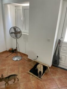Turning to the left a bit you can see a stand fan we bought days after arriving and pet toys back in the corner. We also brought some dog bones which are usually on Basil’s carrier. The fan has worked great but recently stopped spinning. It has been on almost 24/7 since we purchased it and we hope to have it fixed if possible. Dog and cat toys were used all the time.