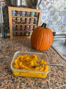 The pumpkins sat on the kitchen counter for several days. Eventually I had a change of heart. Instead of cajoling my hubby into an activity he detests, I roasted one, made homemade pumpkin puree and whipped up some fall inspired food.