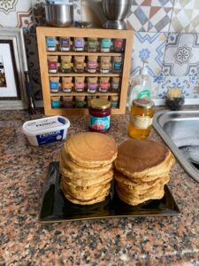Pumpkin Pancakes: The first recipe I made was pumpkin pancakes. They had ginger, cinnamon, allspice, and lemon zest. The pumpkin puree kept them moist. The recipe made quite a stack, so we ate them for several days. We served them with a variety of toppings: butter, honey, preserves, cinnamon sugar, and extra pumpkin spice.