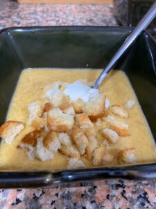 Pumpkin Soup: We made a creamy pumpkin soup. The recipe called for chipotle peppers in adobo sauce, but this is a love/hate ingredient for me. I have purchased several cans in the past, but most of the recipes I make use only a small portion of the peppers. I usually try to freeze the remainder and then they sit unused for months and eventually accumulate freezer burn. This time around I left them out and substituted a Mexican spice blend and some red chilies for an extra spicy kick. We topped the soup with some buttered bread crumbs and a dollop of crème fraîche and it was one of our favorite recipes this year.