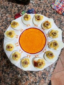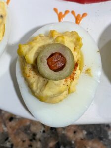Eyeball Deviled Eggs: We love deviled eggs. The amount of spice, the filling, and what you garnish them with are so flexible you can customize them to your tastes and virtually any occasion. We have added bacon and cheese for barbecues, garnished them with caviar for New Year’s Eve, and I like to use a myriad of toppers like fresh dill, paprika, and even capers. We usually make them for Halloween and use black olives to make spiders or green olives to make “eyeballs”.