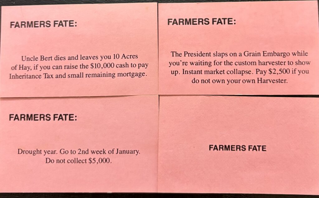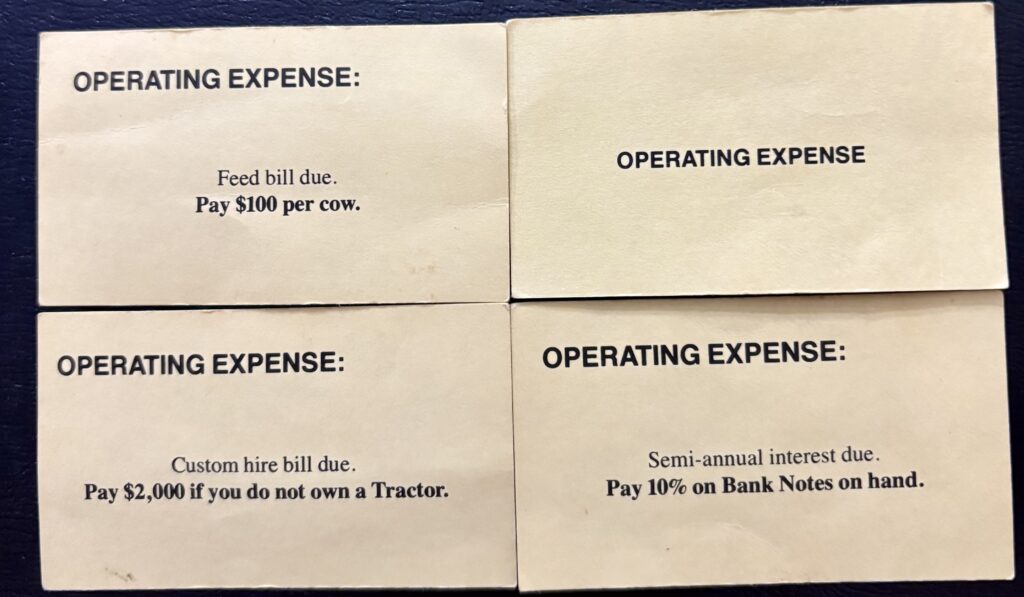 The second really interesting thing is how the game handles your farming income. The first time during a year that you land on a harvest (like Wheat Harvest) you roll a dice and consult a chart to determine the payout. Before the banker gives you this income you draw an Operating Expense card and deduct the amount listed from your paycheck. During the beginning of the game the Operating Expense will often be more than your actual income.