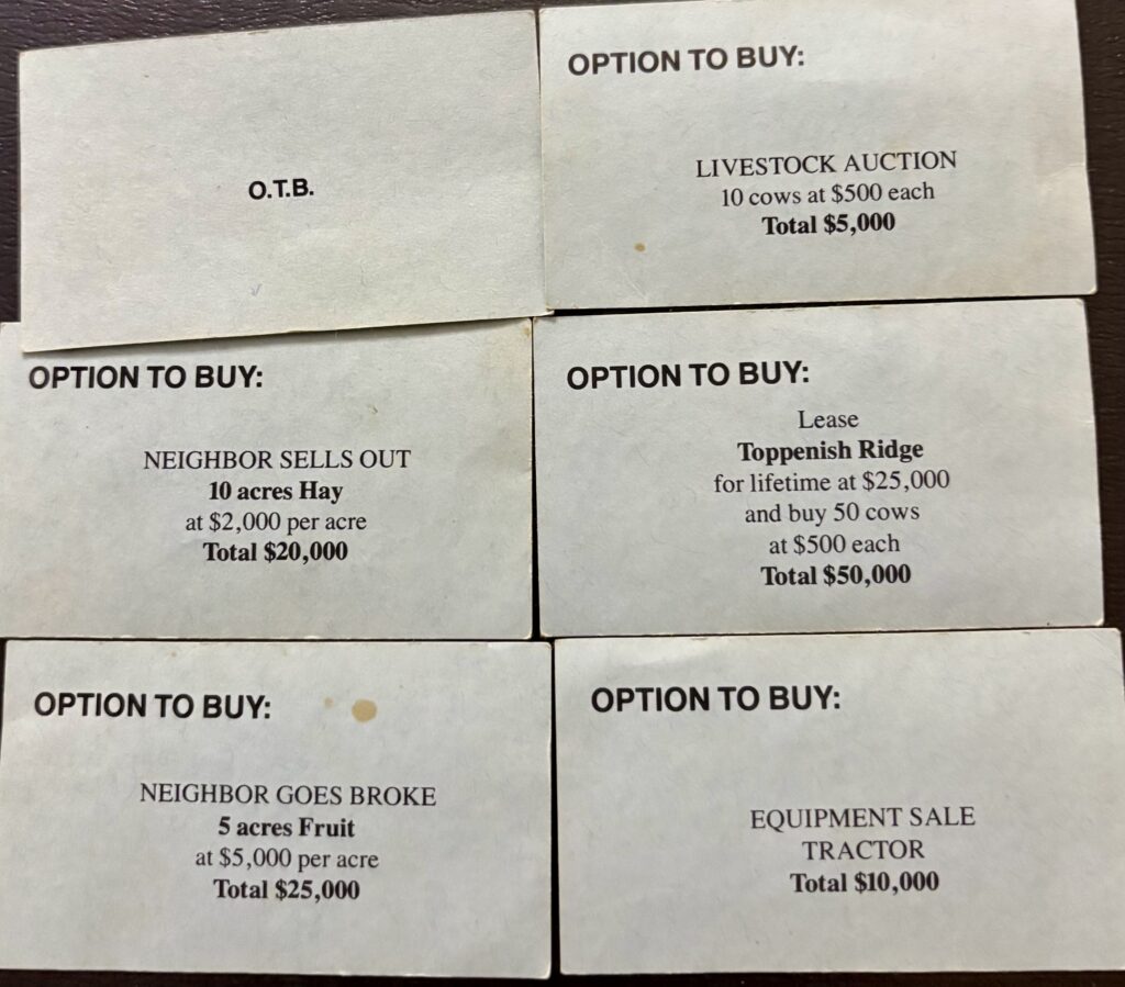 Each player chooses a farmer who owns a farm positioned in the middle of the very Monopoly-like game board. You have inherited the land along with 10 acres of hay, 10 acres of wheat, $5,000, and a $5,000 IOU to the bank. You are also randomly dealt two O.T.B. (option to buy) cards.