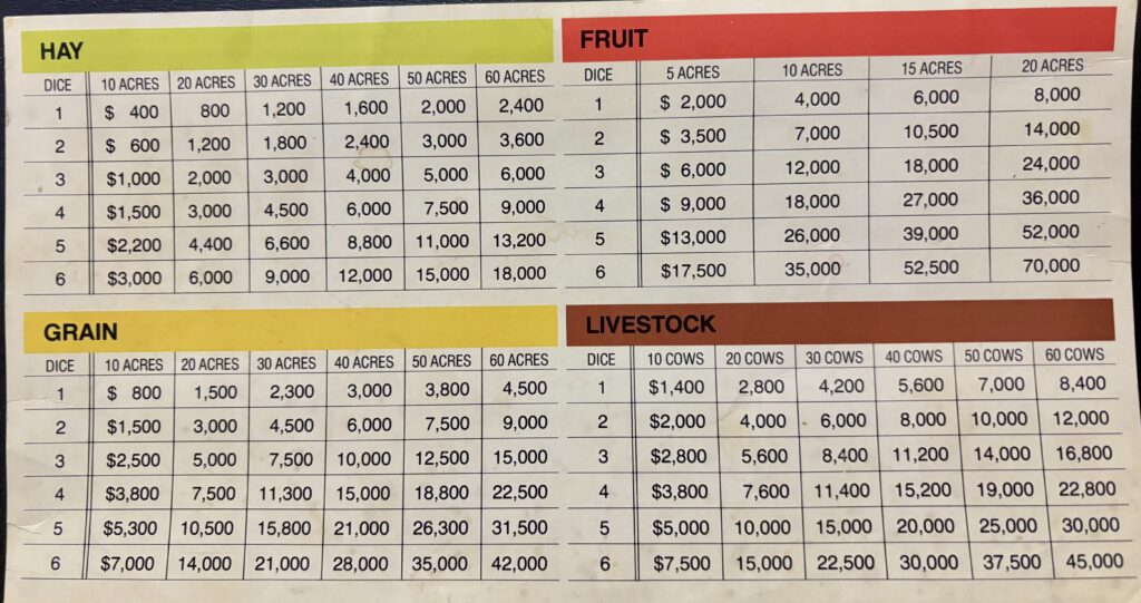 Looking at the above examples let’s say you are rolling for income on your inherited ten acres of Hay. The most you can hope to earn is $3,000 and if you roll anything below a five and draw that custom hire bill card you will owe the bank money. Here is the payout chart in all its glory.
